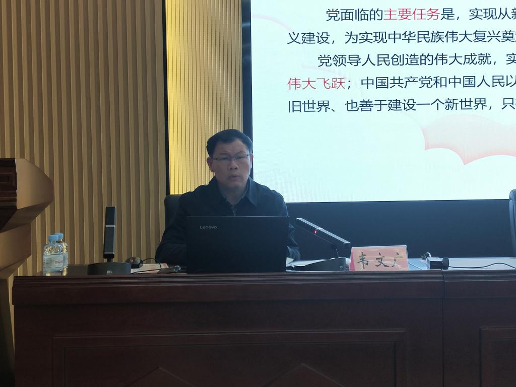 12月16日,必赢3003no1线路检测中心党委举行学习宣传贯彻党的十九届六中全会精神宣讲报告会,学校党委常委、副校长、党委宣讲团成员韦文广作宣讲报告。