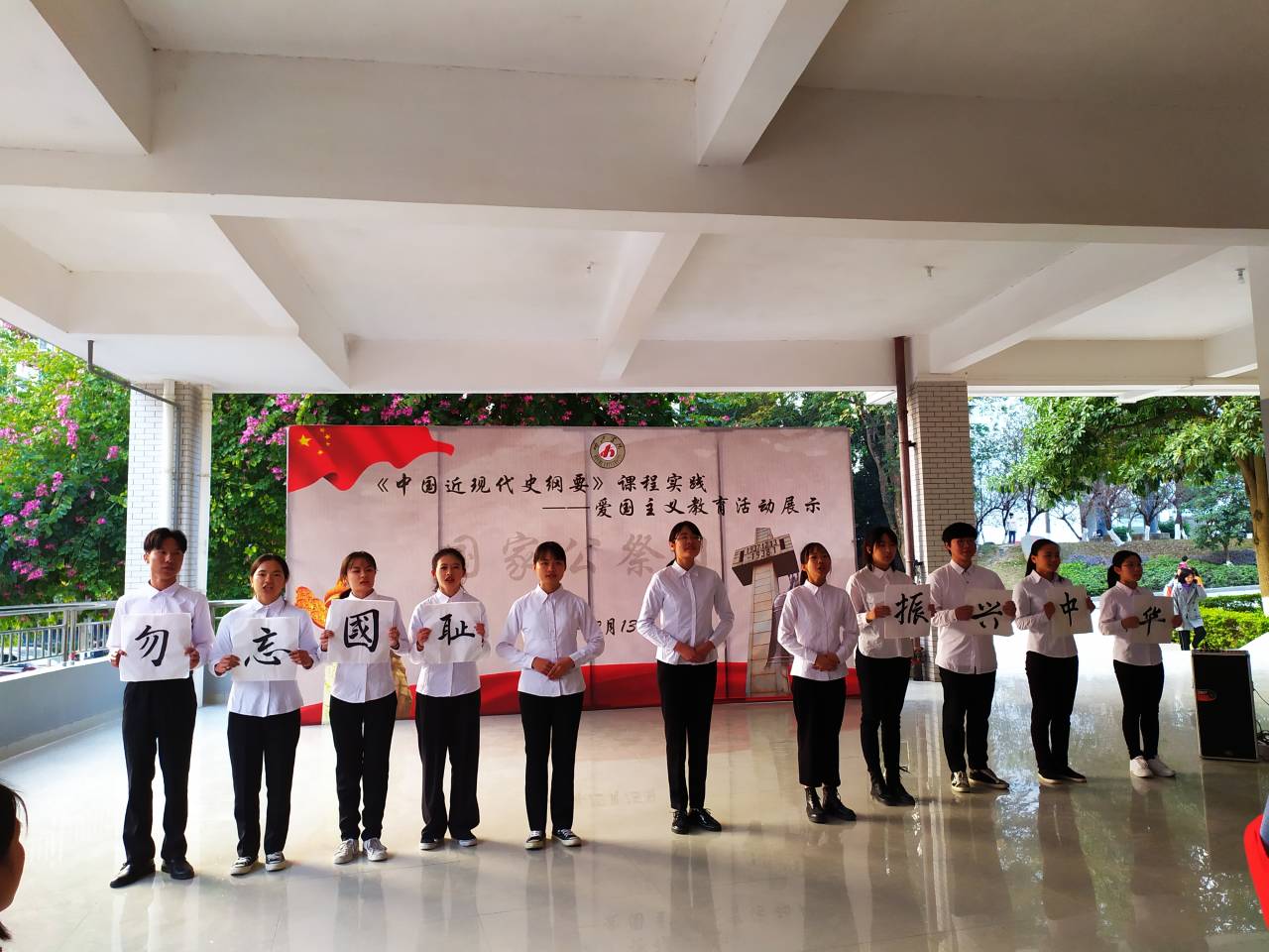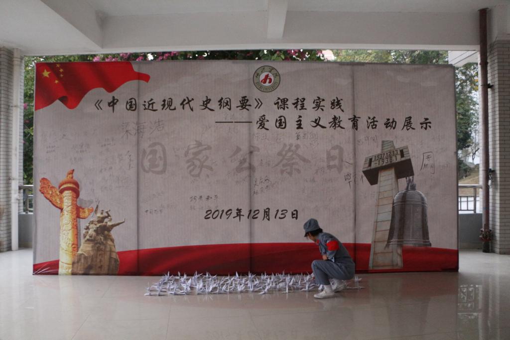 20191213日,是我国第六个国家公祭日,为了祭奠死难同胞,为了牢记侵略战争给中国人民和世界人民造成的深重灾难,为了牢记历史、不忘过去、珍爱和平、开创未来。历史与社会学院结合《中国近现代史纲要》课程,于13日下午在弘毅楼二区一楼大厅举行爱国主义教育活动。本次活动由18社工班与18旅管班联合完成。