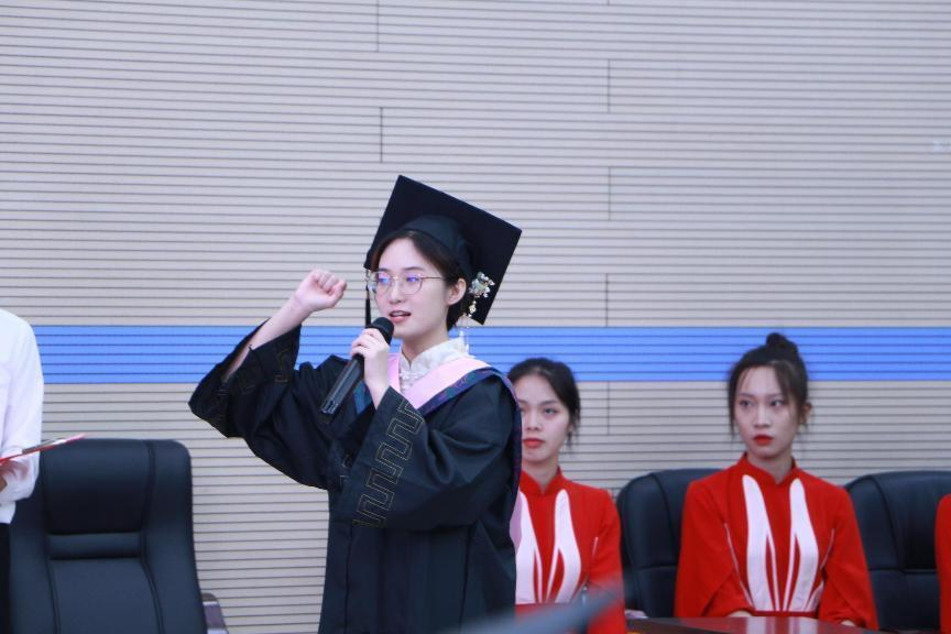 伴随着庄严雄壮的音乐响起,全体师生起立,共同奏唱国歌,仪式拉开序幕。仪式的第一环节是观看毕业短片、学生代表发言和祝福。毕业短片播放之后,首先,毕业生代表陈标、周丽丽、李浩辰、何杰上台发言,虽然仅是一段文字,却蕴含着毕业生们浓郁且深厚的情感、对自我未来的期望、对老师同学的感谢、对母校的依依惜别;其次,非毕业生代表胡梦婷、胡宁俊、宁伟滟、陈振邦向毕业生师兄师姐们送上诚挚的美好祝福;最后,在毕业生代表陈瑶的带领下,全体毕业生进行了庄严的毕业宣誓。