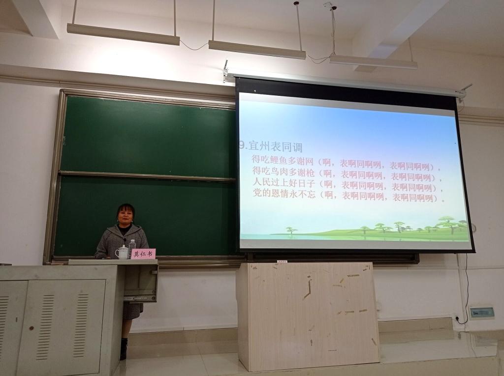 1125日晚,邀请到了广西山歌王中王莫仁书到校作题为桂西北歌曲调及编唱技巧讲座。讲座一开始,莫仁书就以山歌进行自我介绍。随着讲座的推进,莫仁书用三姐调、祥贝调、东屏调、环江调、相思调、莲花落调等来展示山歌的多种唱法,课堂回荡着嘹亮的歌声,课堂氛围达到高潮。莫仁书与同学们积极互动,她还认真细致讲解山歌的句式和韵脚,并教同学唱歌。通过讲座,让同学们对桂西北山歌有了更多认识和了解,激发了同学们对其的学习兴趣,有利于山歌的推广与传承。