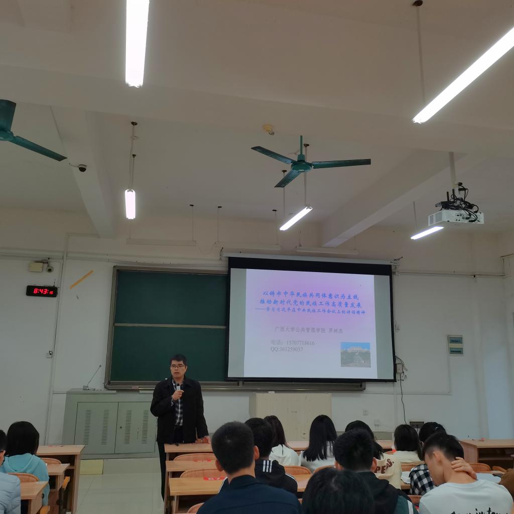 1120日上午,广西大学罗树杰教授在弘毅楼2406教室为师生作题为“以铸牢中华民族共同体意识为主线 推动新时代党的民族工作高质量发展——学习习近平总书记在中央民族工作会议上的讲话精神”学术讲座。他从铸牢中华民族共同体意识是新时代边疆治理的关键文化工程、铸牢中华民族共同体意识的历史基础是由各民族共创展开,讲座以翔实的史料、丰富的案例、生动的语言赢得师生阵阵掌声,让大家受益匪浅。