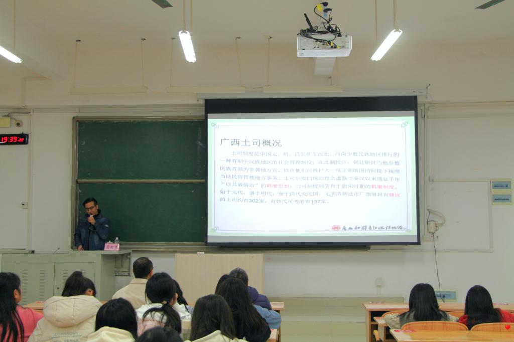 1123日晚,广西博物馆研究员蓝韶昱博士在弘毅楼二区406教室为师生作了题为“明清时期广西土司文献导读”的讲座。蓝博士系统介绍了明清时期关于广西土司历史记录的文献,涉及王朝史、实录、地方志、笔记等诸多形式。摘录了相关文献的内容,并对摘录的文献内容做了翻译及解读。讲座让学生提高了对古代文献的认识,也从多方面多角度增进对广西土司历史和文化的了解,增加了学生学习历史的兴趣。