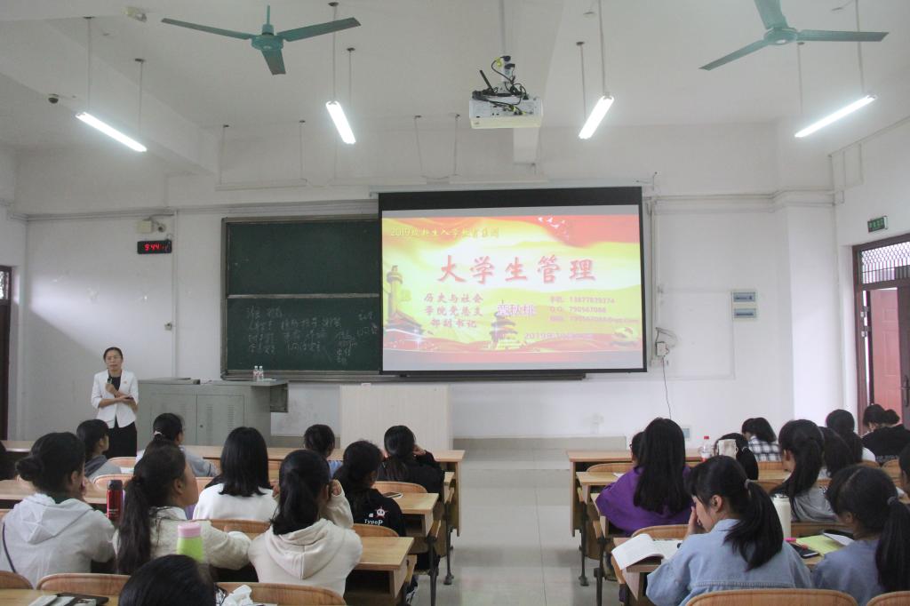 会上,覃秋桃副书记以“大学生管理”为主题,从“不以规矩,不能成方圆,不以制度,不能建秩序”出发,围绕“大学对学生的要求”、“学生相关管理部门介绍”、“学校学生管理制度”、“大学生活的几点建议”等方面内容进行详细准确传达和介绍,借此帮助新生合理安排随后四年的学习生活。最后,她提醒新生在大学四年的学习、生活中至少要培养一种兴趣爱好,丰富自己的大学生活,培养高尚的道德情操,并且希望同学们在今后的大学生中都能做一个有组织有纪律的人。