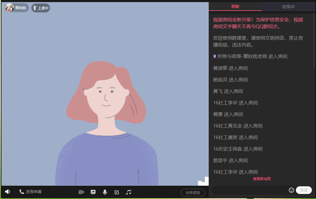 为全力做好2020届毕业生就业工作,2020年5月15日晚,历社学院通过QQ群课堂平台召开2020届毕业生线上年级大会。学院党总支部副书记覃秋桃、团委书记陈玉婷、毕业班班主任和93位毕业生参加此次线上年级大会。