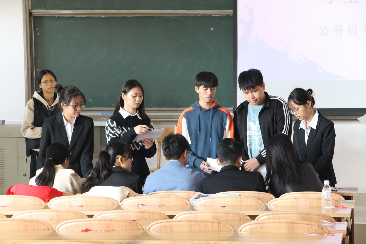 为进一步推进应用型专业转型发展,落实应用型人才培养计划,必赢3003no1线路检测中心于2023年11月18日在弘毅楼五个教室举办公务员考试模拟大赛初赛。学院副院长孙明明、行政管理教研室党支部副书记戴杨艳、行政管理专业教师杨宏源、蔡霞、宾娜等五位老师担任比赛评委。