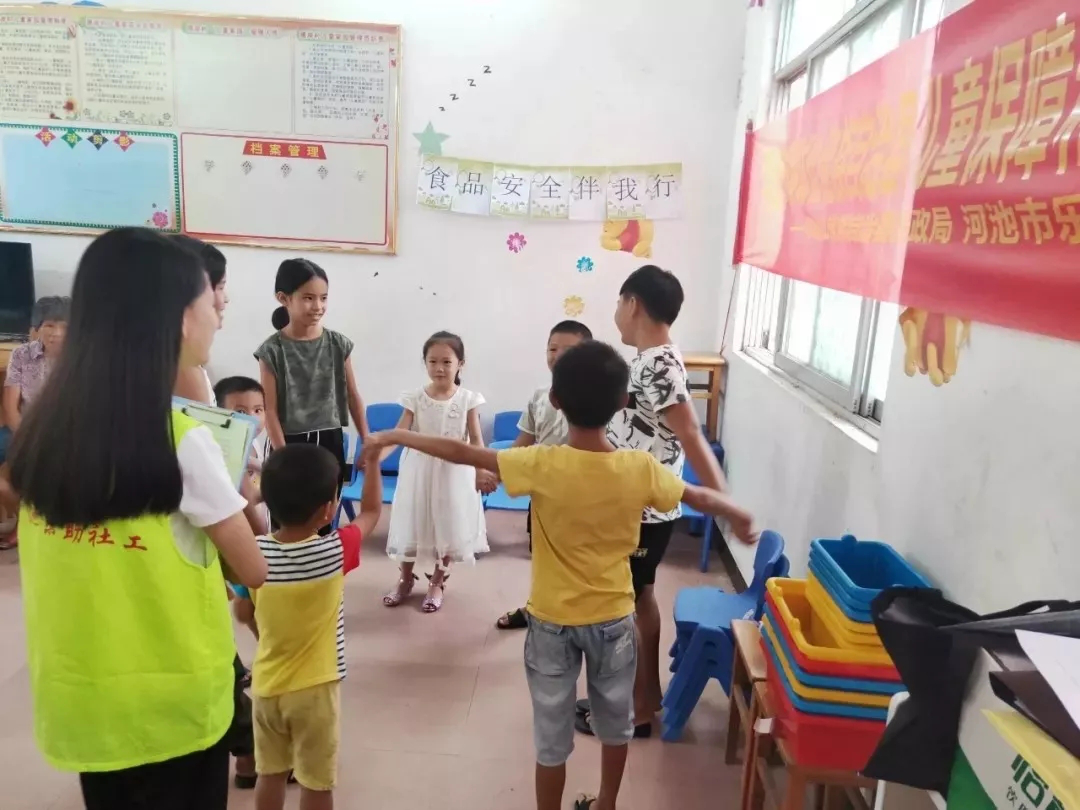 4.2019年8月13日至19日,河池市乐助社工与必赢3003no1线路检测中心社工系师生于寨碑村开展“安全防护,健康成长”安全意识提升小组系列活动,以贴近儿童生活的方式和适合儿童认知能力的活动方式,促进儿童学习安全知识,拓展视野,提高儿童安全意识,让儿童在趣味中掌握知识和提高安全防护能力。
