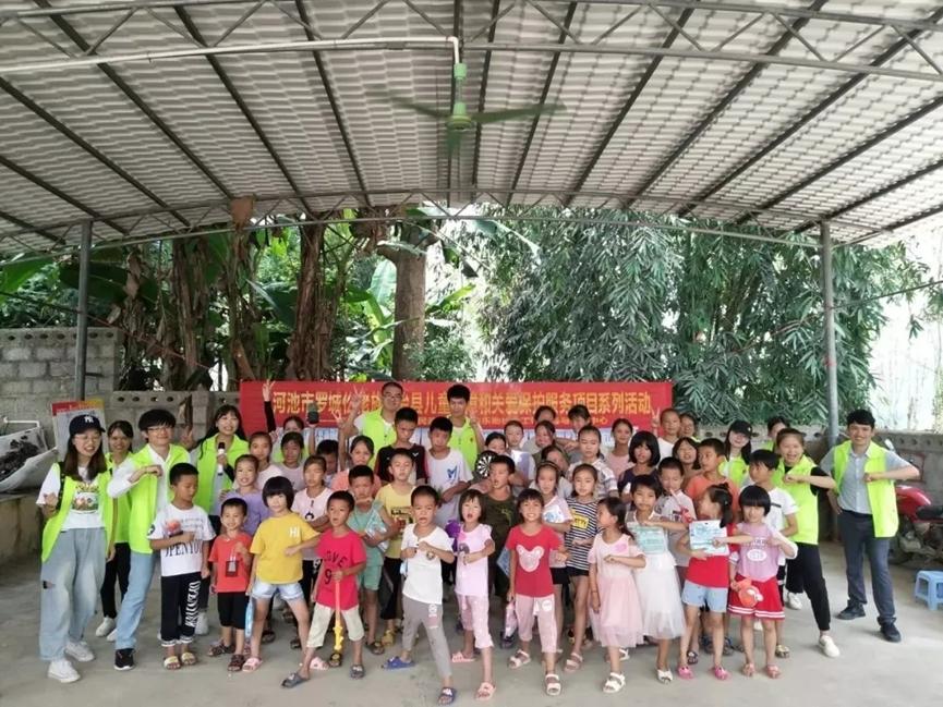 3.2019年8月4日,河池乐助社工与必赢3003no1线路检测中心社工系师生于黄金镇寨碑村开展主题为“大手拉小手,我们在一起”的社区宣传活动。本次活动通过游戏互动、宣传海报、派发宣传资料等形式,让更多的人了解社工及社工服务,为后期工作奠定了基础。