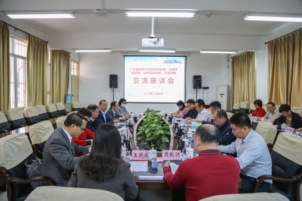 黄平彪介绍了宝安区民政、社会工作发展的基本情况,表示希望通过合作,能够聚焦社会需求,培养专业社会工作人才,保证人才输送,共同推动地方社会工作服务、养老事业高质量发展,同时本着“政校推动、市场主导”的劳务协作脱贫工作原则,推动人才、资源共享,达成劳务协作脱贫、产学研合作的战略联盟,共同助力河池精准扶贫和精准脱贫。