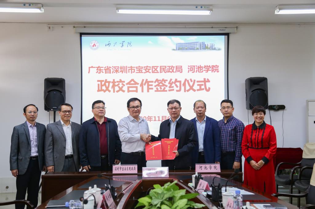 11月6日上午,我校与深圳市宝安区民政局在行政楼206会议室签署战略合作协议。我校党委常委、副校长韦文广与深圳市宝安区民政局党组书记、局长黄平彪分别代表双方签署协议。河池市民政局副局长黄永(主持工作)、宜州区民政局副局长覃洪海、深圳市部分社会工作服务机构负责人、我校地方合作办公室、历史与社会学院部分领导和社会工作系教师代表出席会议。