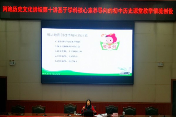 12月5日,柳州市柳北区教育局历史教研员韦云凌在弘毅楼205报告厅作题为“基于学科核心素养导向的初中历史课堂教学情境创设”专题讲座,讲座由历史与社会学院韦福副院长主持,历史学专业师生到场聆听了讲座。