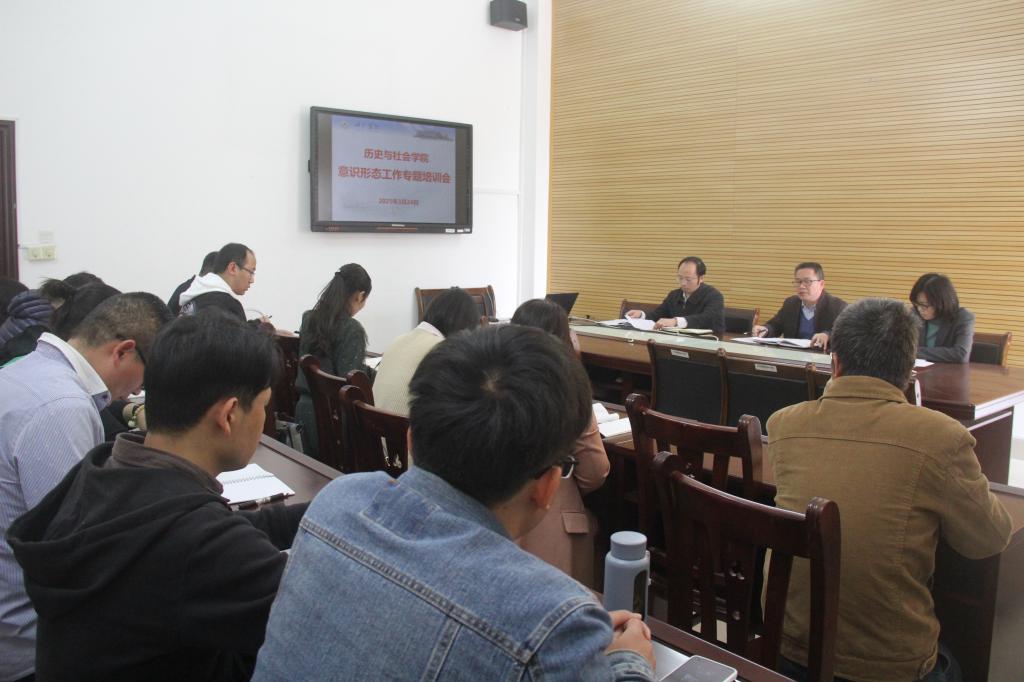为进一步加强和改进意识形态工作,落实学校党委意识形态警示教育大会精神,强化全院教职工意识形态研判能力,牢牢把握意识形态工作主动权,历史与社会学院于2021年3月24日下午,在弘毅楼2区409会议室召开意识形态工作专题培训会。会议由学院党委副书记、院长谢铭主持。