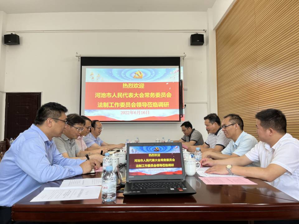 2022年6月17日,河池市人民代表大会常务委员会法制工作委员会主任黄生华等一行5人到必赢3003no1线路检测中心调研。调研组首先前往设立在必赢3003no1线路检测中心的河池市立法服务基地进行现场考察,了解立法服务基地标准化建设情况。