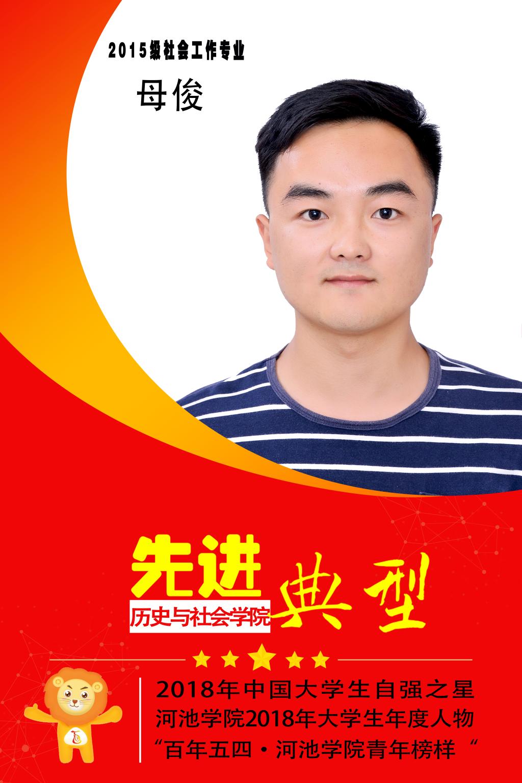 母俊,男,汉族,河池学院历史与社会学院社会工作专业2015级学生。2015年曾任河池学院社会工作专业第一任班长;2015年创办河池学院大学生社会工作协会;曾任2016级社会工作班班主任助理;曾被聘为广西共青团新媒体河池学院中心编辑;曾任河池学院易班学生工作站第三任站长。在校期间组织或协助组织多次校级活动,具有较大影响力。具有奉献精神,2019年成功捐献造血干细胞,拯救了一个生命,充分发挥学生干部的先锋模范作用。