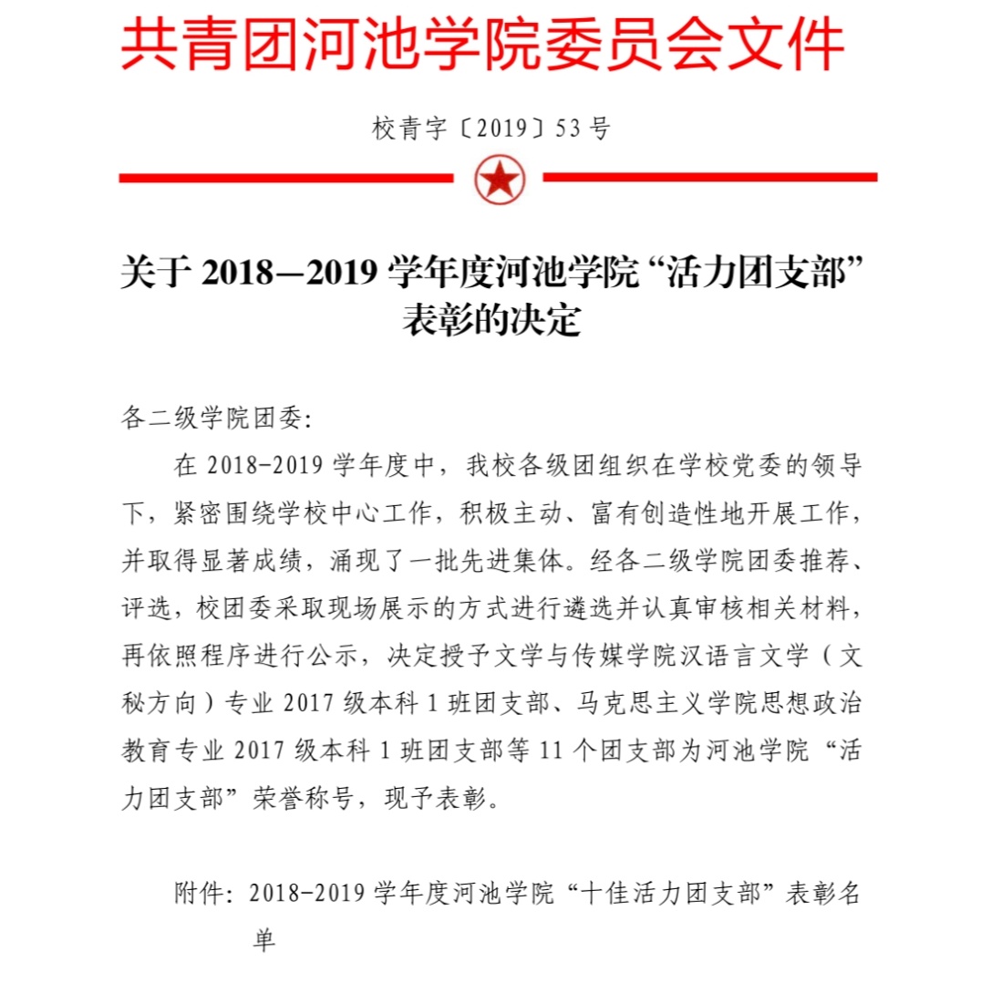 近日,根据共青团河池学院委员会办公室下发《关于2018——2019学年度河池学院“活力团支部”表彰的决定》文件获悉,必赢3003no1线路检测中心历史学专业2017级本科班团支部获评河池学院“活力团支部”称号。