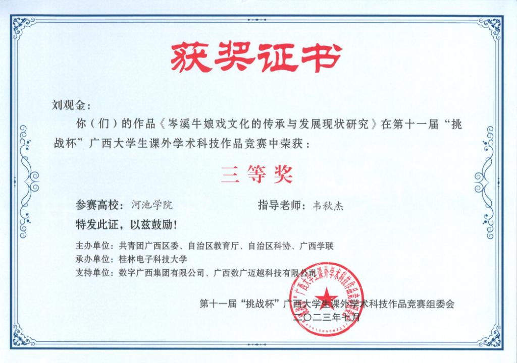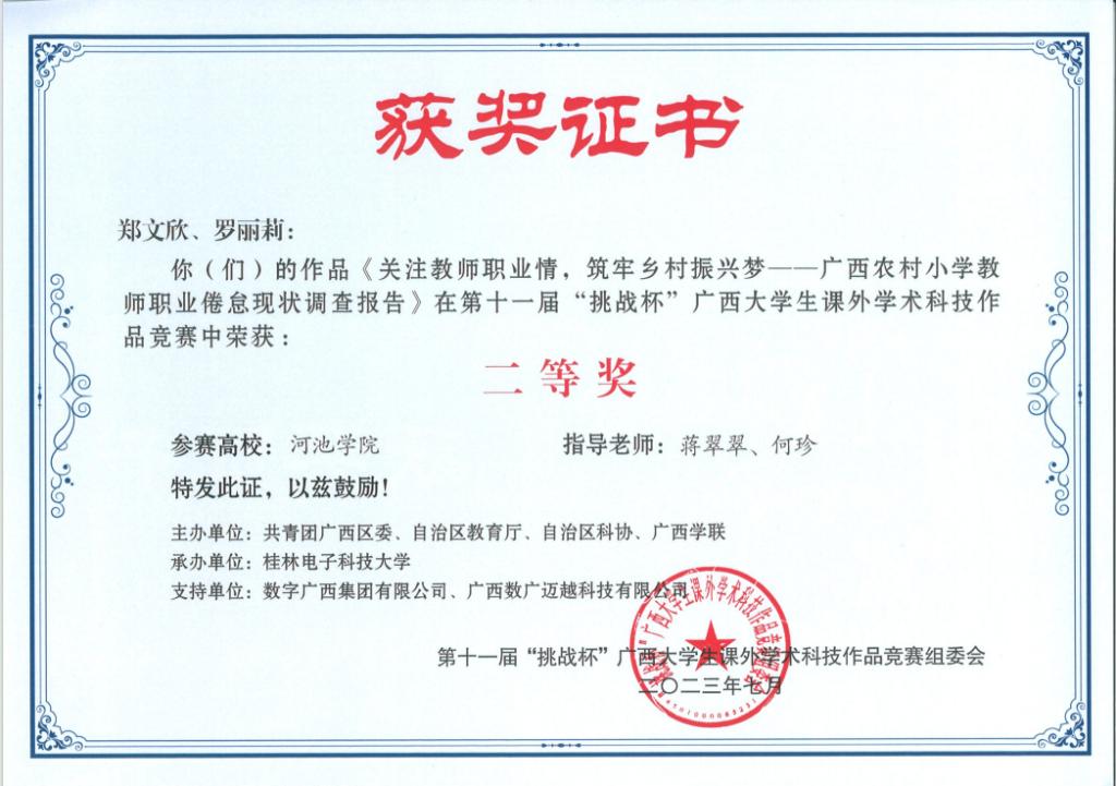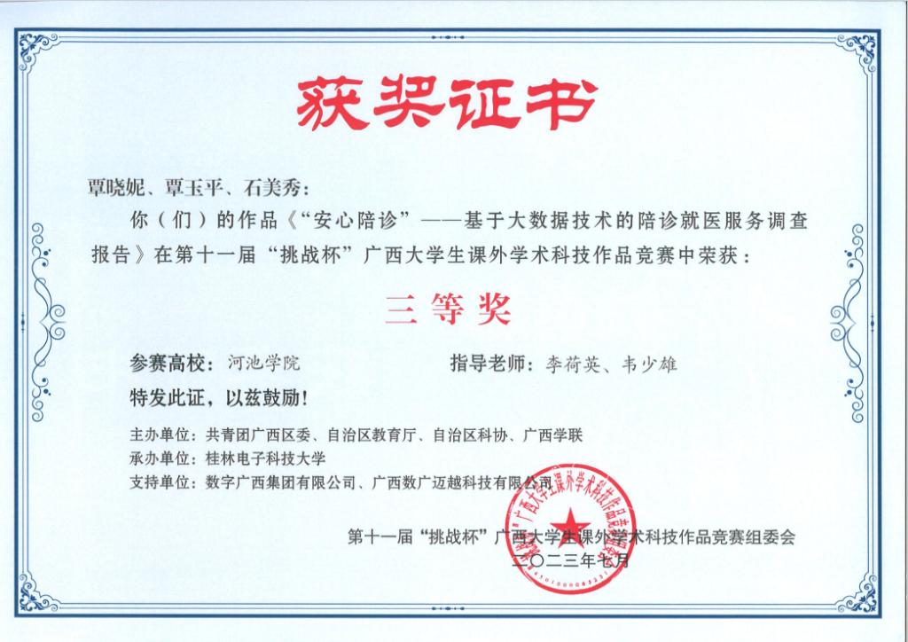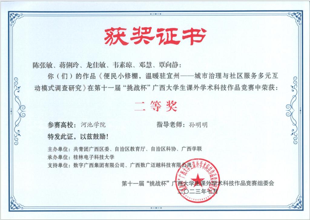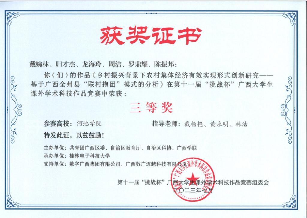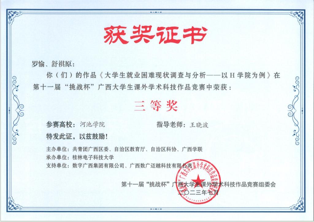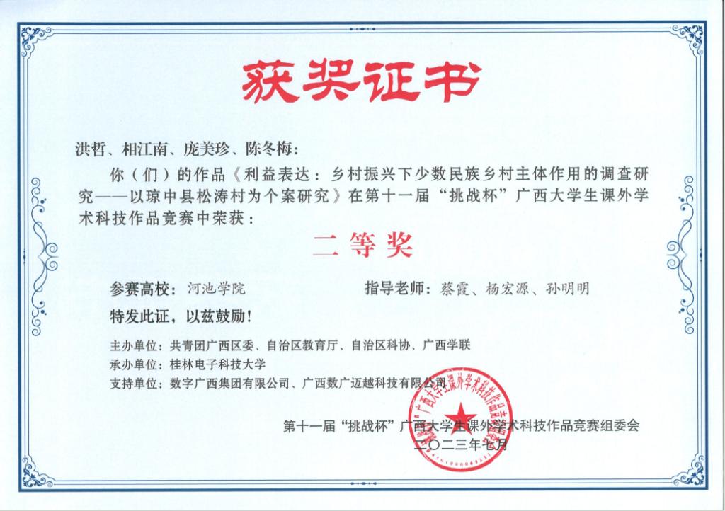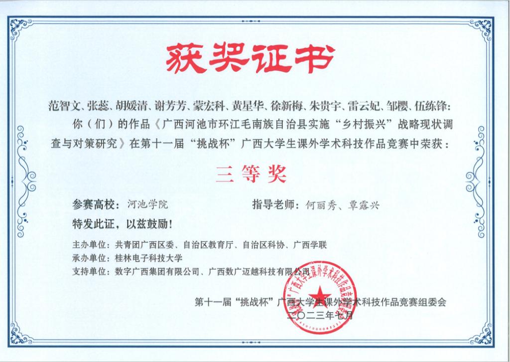 近日,广西壮族自治区教育厅等部门联合发布《关于公布第十一届“挑战杯”广西大学生课外学术科技作品竞赛获奖名单的通知》(桂青联发【2023】12号),必赢3003no1线路检测中心荣获二等奖3项、三等奖5项。