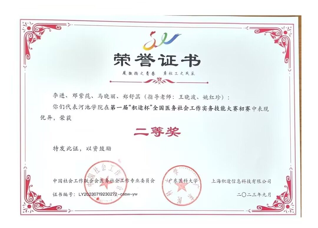 近日,中国社会工作联合会医务社会工作专业委员会公布了第一届“积途杯”全国医务社会工作实务技能大赛初赛获奖名单,由社会工作教研室王晓波、姚红珍两位教师指导,2020级社会工作专业学生李进、邓紫纯、马晓丽、郑舒菡等组成的团队荣获二等奖。